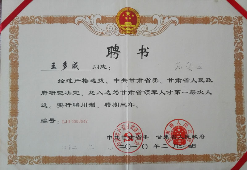 2010年榮獲入選為甘肅省領(lǐng)軍人才第一層次人員證書